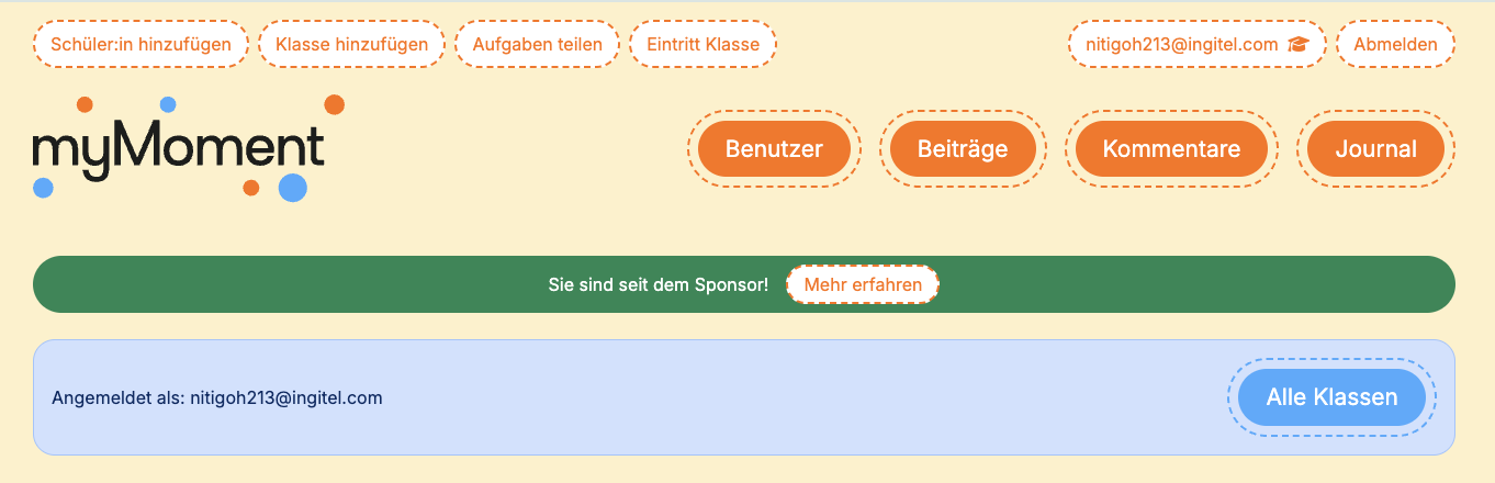 Haben Sie bereits eine Klasse auf myMoment erfasst, sehen Sie mit Klick auf ihren Benutzernamen im blauen Feld "Alle Klassen".