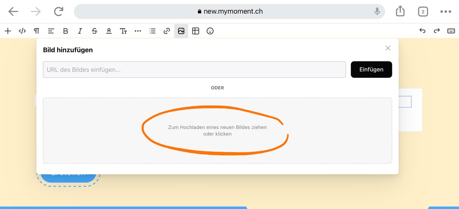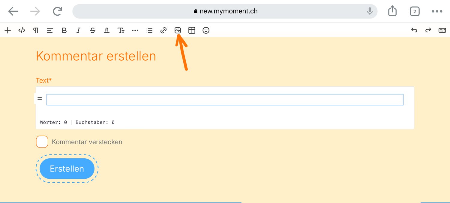 Du gehst zum Feld "Kommentar erstellen" und wählst in der Bearbeitungsleiste das Symbol für "Bild-einfügen".