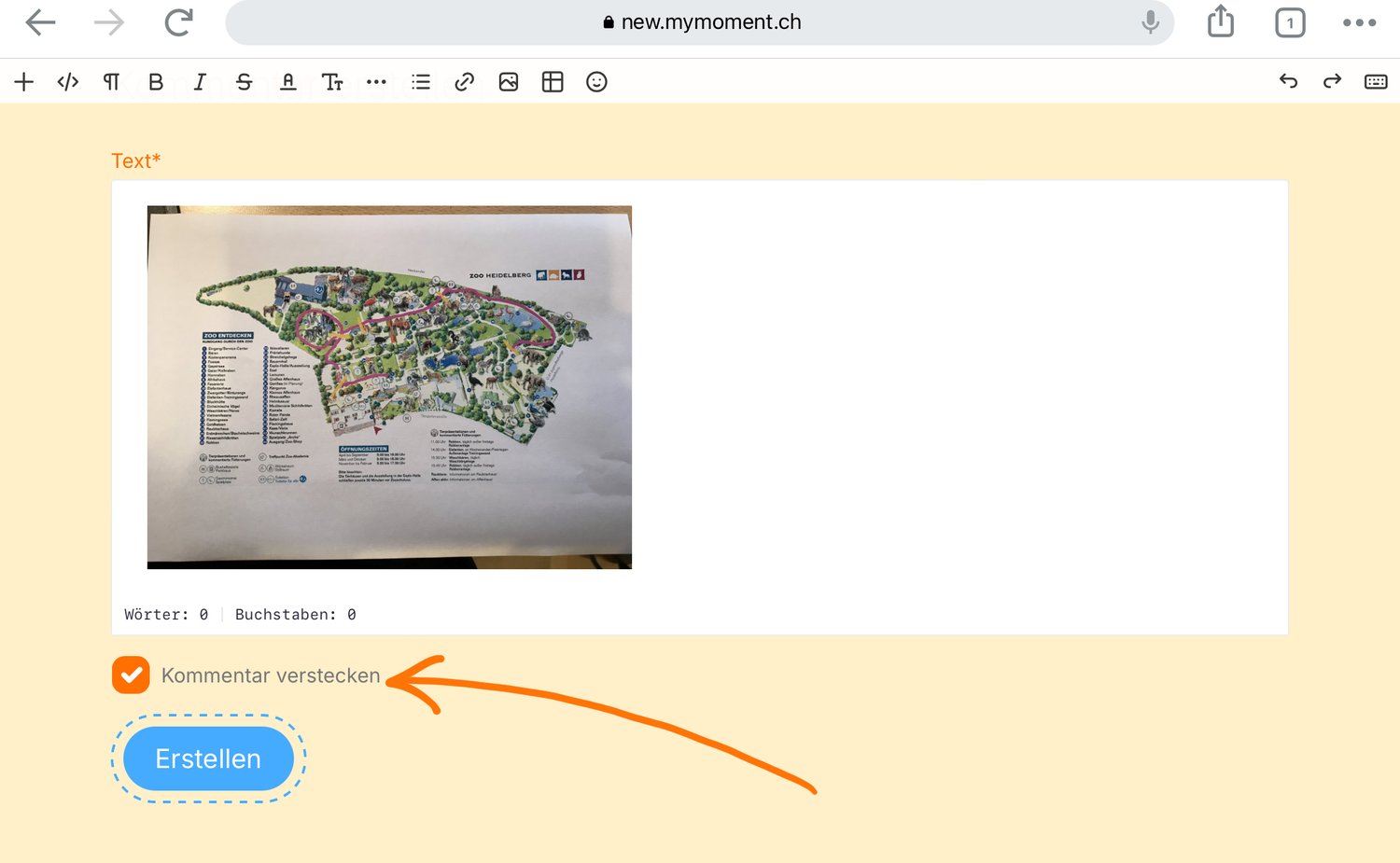 Denke daran, den Kommentar zu verstecken, wenn dein Bild zum Beispiel wie beim Zoo-Plan die Lösung zu einem Rätsel ist!