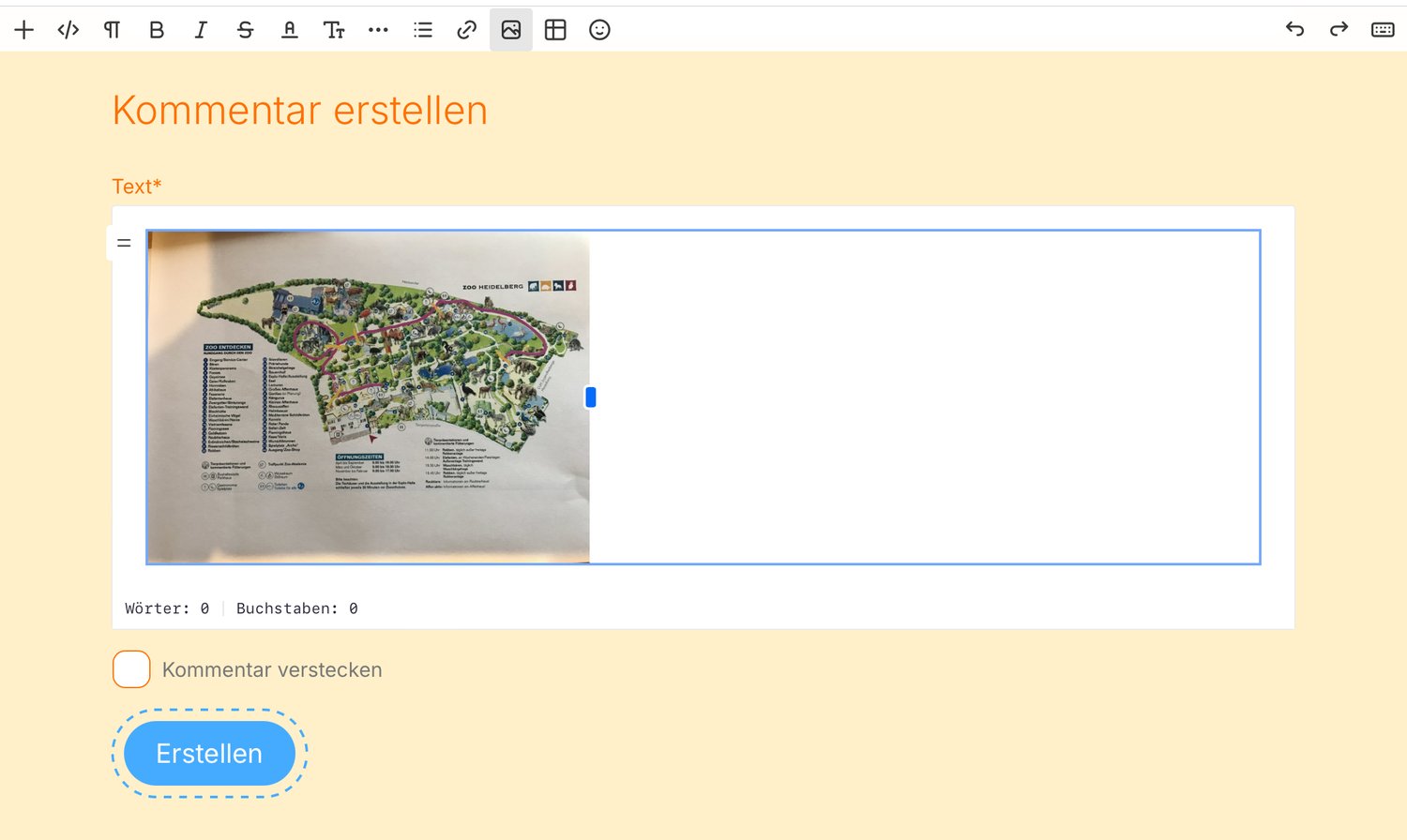 Wähle das Bild aus, das du einfügen möchstest. Es erscheint im Kommentarfeld. Passe die Grösse an.