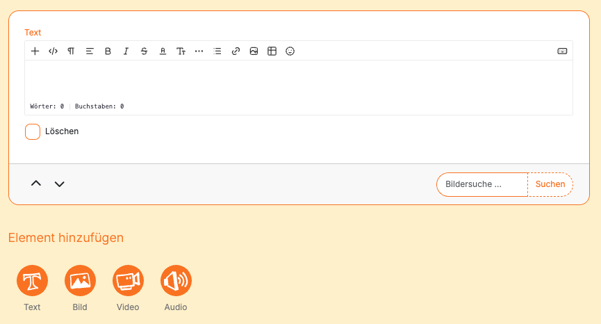 Im Textelement findest du unten rechts die Bildersuche. Gib deinen Suchbegriff ein und wähle "Suchen".