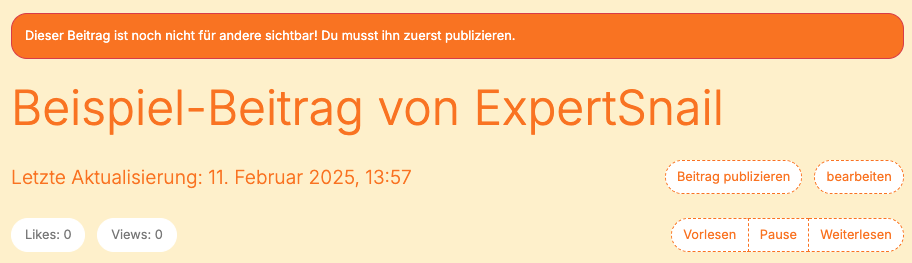 Der orangene Balken oben weist dich darauf hin, dass der Beitrag noch nicht für andere sichtbar ist. Er ist noch nicht publiziert.