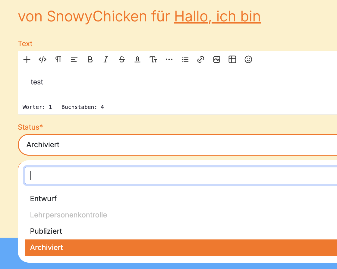 Anschliessend muss der Beitrag oder der Kommentar noch gespeichert werden. Die Lehrperson kann zu einem späteren Zeitpunkt den Beitrag auch wieder in den Enwurf-Status oder auf "Publiziert" setzen und speichern. Dann ist er entweder für den/die Ersteller:in oder Klasse/alle wieder sichtbar.