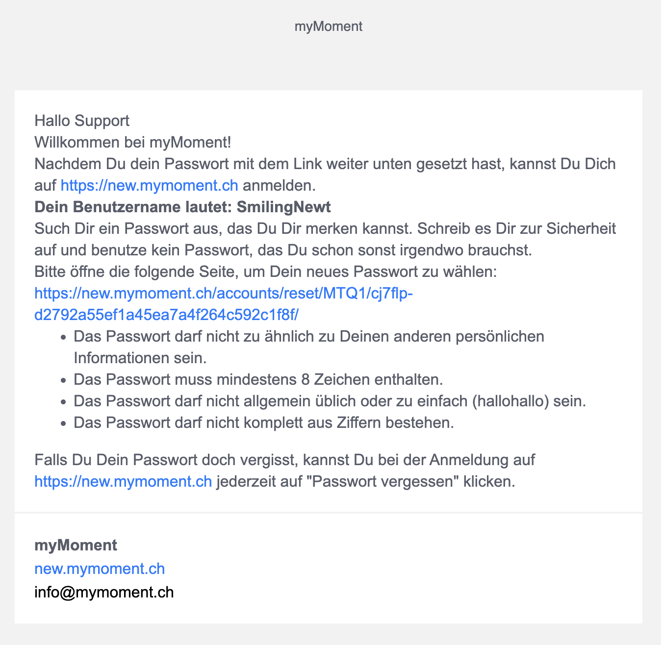 Deine Lehrperson registriert sich auf myMoment und eröffnet dort eine Klasse. Sobald sie dich als Benutzer erfasst hat, erhältst du von myMoment eine E-Mail.