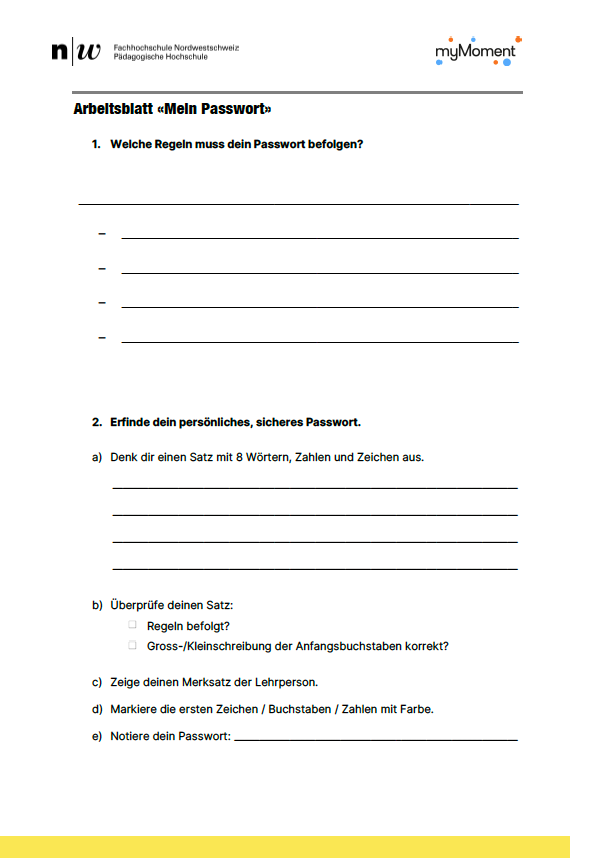 Die Schüler:innen erarbeiten nun selber ein persönliches Passwort für myMoment mit den Hilfestellungen (Merksatz) auf dem Arbeitsblatt. Die Lehrperson überprüft mit gemeinsamen mit dem jeweiligen Schüler / der jeweiligen Schülerin, ob die Regeln eingehalten wurden und ob die Rechtschreibung der Anfangsbuchstaben stimmt.