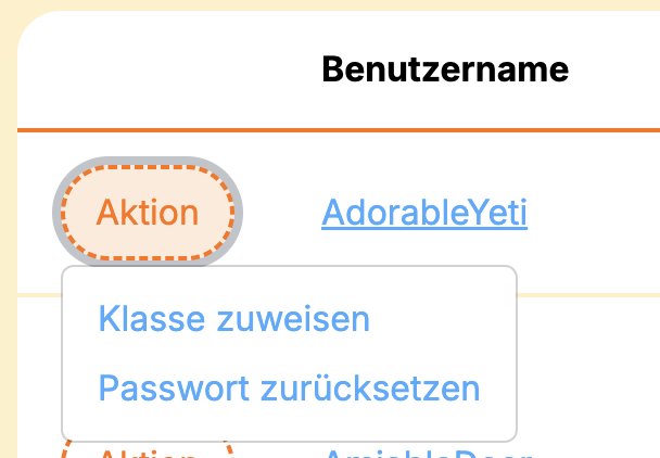 Wählen Sie neben dem Benutzer, den Sie einfernen möchten den Button "Aktion" und dort "Klasse zuweisen".