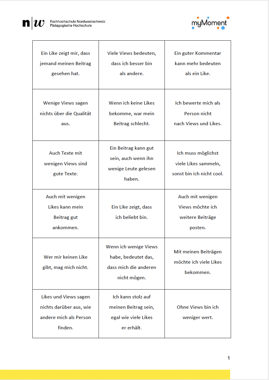 Die Ergebnisse werden im Plenum vorgestellt und besprochen. Dabei gilt es auch, die Schüler:innen (nochmals) darauf hinzuweisen, dass auf myMoment ALLE Schüler:innen der ersten bis neunten Klasse mitmachen dürfen. Bei der Like-Vergabe soll man sich also in die mögliche Autorin oder den Autoren hineinversetzen und überlegen, welche Kompetenzen und Schreiberfahrungen diese Person mitbringen könnte.