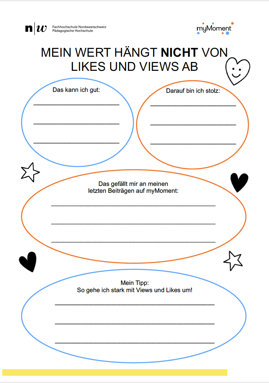 In Einzelarbeit erarbeiten die Schüler:innen das Arbeitsblatt «Mein Wert hängt nicht von Likes und Views ab» und halten darauf ihre Erkenntnisse mit den vorherigen Auseinandersetzungen fest.