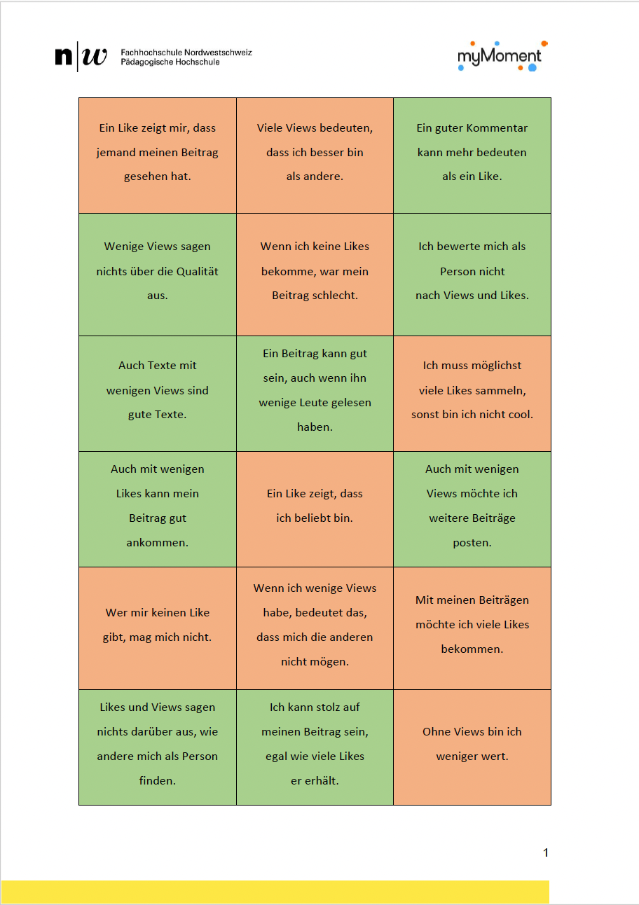 Die Schüler:innen entscheiden in Partnerarbeit, ob die Aussage auf den ausgeschnittenen Kärtchen (AB „Was sagt ein Like oder View aus?“) stimmt oder nicht und begründen im Gespräch ihre Meinung.